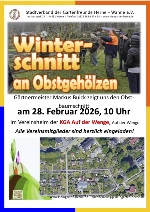 Am Samstag, 28. Februar 2026 veranstaltet der Stadtverband der Gartenfreunde Herne – Wanne e.V. in unserer Anlage den Lehrgang „Winterschnitt an Obstgehölzen“.